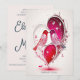 Celebre a sua história de amor com este convite de casamento lindamente desenhado, apresentando um layout romântico frente e verso. A frente apresenta uma ilustração artística deslumbrante de dois pássaros intricadamente detalhados, enquadrados por flores e motivos de coração em tons ousados de vermelho e magenta - simbolizando união, paixão e união. O verso apresenta uma tipografia elegante em azul-marinho profundo sobre um fundo de rosa suave, destacando os nomes do casal em uma escrita fluida que irradia calor e alegria.