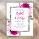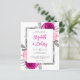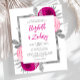 Este design apresenta buquês exuberantes de flores cor-de-rosa-quente, cor-de-rosa-pastel e prateadas enfeitando uma estrutura retangular de folha fina prateada. Personalize o texto em um fundo branco com os primeiros nomes da noiva e do noivo no moderno roteiro de escrita manual rosa-quente, com a data, a hora e o local de casamento em fontes de sans serif de cinza de carvão. A parte traseira da placa é um tom correspondente de rosa quente sólido.