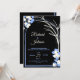 Um convite de casamento preto e branco com flores azuis e brancas em fundo preto. O convite apresenta os nomes da noiva e noiva, Richard e Juliana, juntamente com a data, hora e local do casamento.