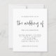 Convite de Casamento Preto e Branco Minimalista. Uma alternativa de preço acessível com 4,5” x 5,6” de tamanho. Disponível em PAPEL CARTÃO 110 lb SEMI BRILHANTE, que é a opção padrão (recomendado para convites, semelhante à espessura de um cartão postal), OU PAPEL MAIS FINO 80 lb COM ACABAMENTO SEDA (ideal para inclusões). Envelopes são opcionais e são ligeiramente maiores que o tamanho do cartão. Uma tipografia elegante é usada para o título principal "O Casamento" complementando o restante do texto que você pode personalizar facilmente.