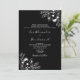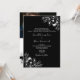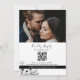 Convite de casamento boho preto e branco elegante e moderno, tudo em um, com código QR para RSVP, site, foto do casal, renda floral dourada e caligrafia simples.