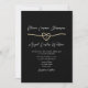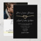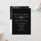 Combine a elegância clássica com a conveniência moderna usando este convite de casamento com QR code preto e dourado. Com um coração de corda dourada romântico, fundo preto elegante e uma foto no verso, este design sofisticado permite que os convidados respondam facilmente via QR code. Personalize com seus detalhes e crie uma experiência de convite sofisticada e contínua.