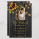 Convite de cerimônia e recepção de casamento rústico no campo com modelo de convite econômico e sofisticado em um só, com fundo de madeira de celeiro marrom escuro com foto em forma de arco e código QR para responder online, apresentando grandes buquês de girassóis amarelos dourados, cordões de luzes cintilantes e uma tipografia dourada falsa e elegante. +++++++++++ Fácil de personalizar com seus detalhes! ++++++++++++ O convite é adequado para casamentos rústicos ao ar livre em jardins e quintais.