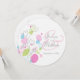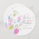Lindos contornos de flores azuis e verdes, cor-de-rosa, e pétalas de flores de confete gráfico ao redor do círculo de convite de casamento. Edite este convite com suas palavras. Ilustrada e projetada exclusivamente por Sarah Trett.