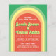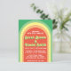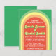 Um convite de casamento retrô com um arco-íris arqueado e fontes funky com efeito de sombra para os nomes da noiva e do noivo. É colorido, com verde, laranja e amarelo.