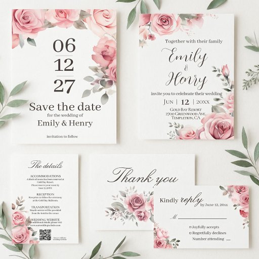 Este convite de casamento floral rosa bege apresenta rosas românticas suaves e uma tipografia de letra cursiva elegante, perfeito para um estilo de casamento atemporal e refinado.