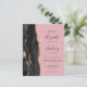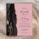 A borda esquerda deste elegante convite de casamento moderno apresenta uma coloração aquosa preta, borda agitada, aparada com falso brilho dourado. O texto personalizável combina manuscrito off-black, fontes copperplate e itálico em um plano de fundo rosa. O verso apresenta um design de agate preto e dourado correspondente.