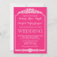 Convite de casamento em estilo vintage e rústico com fundo rosa vibrante e fonte branca. Decorado com uma borda de flores Victorianas na frente. A parte de trás do cartão é decorada com um padrão de diamantes vintage. Design clássico para o seu dia especial. Personalize a fonte e o texto para qualquer ocasião, como chá de noiva, chá de bebê, festa de noivado, despedida de solteira, festa de aniversário e mais.