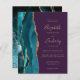 A borda esquerda deste elegante convite de casamento moderno apresenta uma coloração aquosa lacrimogênea aparada com uma falsa brilha de ouro. O texto personalizável combina manuscrito dourado, fontes em copperplate e itálico em um fundo roxo opulente profundo. O verso apresenta um design de chaleira e de agata dourada.