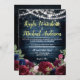 Convites De Casamento Floral Russo Burgundy & Marinho. Apresentando um fundo de pranchas de madeira rústica escura com flores de burgundy Merlot e flores de marinho com verde no fundo. As luzes piscando podem ser encontradas penduradas no topo.