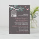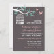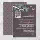 Convite de casamento rústico com gaiola de pássaro vintage pendurada em uma árvore e dois pássaros de amor voando livremente. Decoração com padrão vintage no verso do cartão. Personalize o texto para chá de noiva, chá de bebê, festa de noivado, despedida de solteira, churrasco, aniversário, aniversários de casamento e muito mais. Obtenha cartão de resposta, selo postal e adesivos correspondentes na minha loja zazzle.