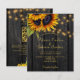 Modelo de convite de casamento elegante e sofisticado para verão ou outono com orçamento estiloso, com RSVP online em madeira de celeiro marrom escuro, apresentando belos girassóis laranja enferrujado e dourado amarelo e cordas ou luzes cintilantes. Fácil de personalizar com seus detalhes e um código QR de varredura gerado automaticamente para seu site ou qualquer outro link online.