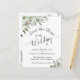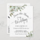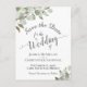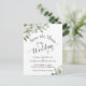Este belo convite de casamento apresenta um design rústico pintado à mão com aquarela, com folhas de eucalipto, folhagens e vegetação em tons de verde-salvia. A letra elegante é uma caligrafia cursiva rendada que dá ao cartão um estilo sofisticado boho chic. O verso tem um gráfico fofo de "marque-nos com lápis" além de espaço para um site e outras informações.