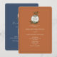 A mistura de terracota terrosa e azul-marinho criará uma atmosfera tão aconchegante e convidativa para o seu casamento de outono. O monograma de folhas rústicas adiciona um toque boho encantador, e o código QR é uma maneira genial de tornar as respostas contínuas. É a combinação perfeita de elegância minimalista e conveniência moderna.