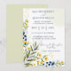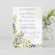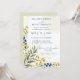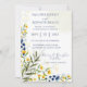 Este convite para o casamento apresenta um elegante e floral design com flores amarelas e azuis do estilo aquarela e folhas verdes decorando os lados. O fundo tem uma lavagem aquosa leve e macia, acrescentando ao delicado e artístico estético. O layout está bem organizado, com os principais detalhes claramente destacados.