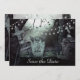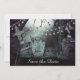 Este anúncio de casamento Save the Date apresenta um cemitério gótico em tons de cinza. As velhas lápides estão espalhadas com luzes encantadoras penduradas em árvores assustadoras.