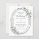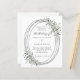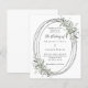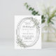 Um fundo branco. Uma estrutura de prata falsa oval decorada com verde-sábio. Personalize e adicione seus nomes, detalhes. Texto preto. 1 folha = 1 convite impresso de borda a borda.