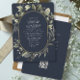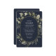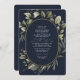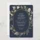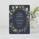 Desfrute de uma ilustração minimalista de verde e eucalipto em aquarela sobre um fundo azul marinho contrastante, combinada com uma tipografia de caligrafia elegante com um toque de oval dourado. Economize dinheiro adicionando detalhes e código QR no verso para que seus convidados respondam.