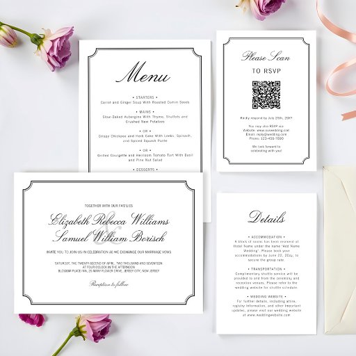 Personalize este belo convite de casamento horizontal, simples, mas belo e elegante. Design branco com quadro de borda preta e com texto de script clássico.