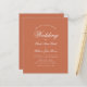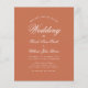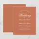 Um convite de casamento simples e econômico, com design minimalista. Possui apenas texto branco sobre fundo terracota. A palavra Casamento e os nomes são escritos em uma fonte caligráfica elegante.