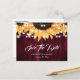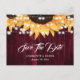 Convites de casamento rústicos burgundy e girassol Save the Date com girassóis e luzes de corda em um fundo de madeira rústica. Itens correspondentes disponíveis.