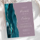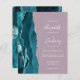 A borda esquerda deste elegante convite de casamento moderno apresenta uma borda de ágata em aquarela azul-teal aparada com brilho de prata falsa. O texto personalizável combina caligrafia branca, fontes copperplate e itálico em um fundo mauve. O verso apresenta um design de ágata correspondente em azul-teal e prata.
