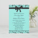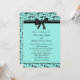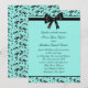 Convite de casamento 5x7 com desenho de videira em redemoinho azul turquesa e preto envolto em um lindo laço preto