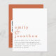 Texto Simples Código QR Casamento Terracotta. Um alternativo de 4,5 pol x 5,6 pol com preço inferior. Disponível em um STOCK DE CARTÃO SEMI-GLOSS 110 lb, que é a opção padrão (mais espesso para convites), OU um STOCK de PAPEL THINNER FINISH 80 lb FINISH (ideal para gabinetes). Adicione seu código QR ao seu site de casamento no verso faz com que esta seja uma opção conveniente para seus convidados para RSVP e veja todos os detalhes sem a necessidade de RSVP separado e cartões de detalhes. Simples e. Informal, seus primeiros nomes são grandes em na moda em baixo, em terracota, com os detalhes abaixo. Personalize facilmente o texto. Na parte de trás está um terracota coordenador.
