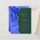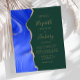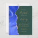 A borda esquerda deste elegante convite de casamento moderno apresenta uma real cor azul-d-água agata borda com falsa brilho dourado. O texto personalizável combina manuscritos dourados, placas de impressão e fontes itálicas em um fundo verde esmeralda. O lado inverso apresenta um design real azul e dourado.
