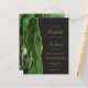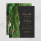 A borda esquerda deste convite de casamento moderno e elegante apresenta uma borda de ágata em aquarela verde caçador com brilho dourado falso. O texto personalizável combina escrita à mão em dourado, fontes copperplate e itálico em um fundo preto-claro. O verso apresenta um design de ágata verde e dourado correspondente.