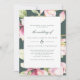 Um convite de casamento moderno com uma reviravolta. Este design apresenta um fundo verde-sábio escuro coberto com flores e ramos de folhas cor-de-água rosa e verde, e detalhes de casamento estão em um retângulo branco no centro. O reverso também está em verde-escuro sólido.