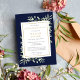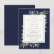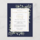 Um convite cartão postal personalizado elegante e botânico de celebração da vida com vegetação em aquarela, apresentando folhagem de vegetação em aquarela botânica em um fundo azul marinho. Projetado por Thisisnotme©
