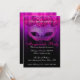 Convite de Celebração de Festa de Mascarada Rosa e Roxo. Um convite elegante e sofisticado com uma máscara de mascarada em tons de rosa e roxo com detalhes pretos, um fundo em tons de roxo/rosa com um padrão damasco sutil sobreposto em preto e tipo elegante personalizável para os detalhes da sua festa.