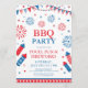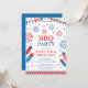 Convite de festa de churrasco festivo do Dia 4 de Julho com moldura, bandeiras e fogos de artifício isolados em fundo branco. Design para convites do Dia da Independência Americana. Tipografia personalizável em vermelho e azul.