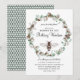 Um convite de chá de bebê único com tema de mamãe abelha, apresentando abelhas e uma grinalda floral botânica de eucalipto e algodão. Padrão de favo de mel no verso do convite.