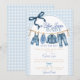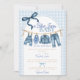 Legal, casual e cheio de charme, este convite de chá de bebê em azul jeans apresenta uma adorável corda de roupa de jeans pendurada com pequenas roupas de menino, sapatos e acessórios de jeans sobre um clássico fundo xadrez azul. Perfeito para um tema "Blue Jean Baby Is On The Way", chá de bebê de jeans, ou chá de bebê de roupa de menino pendurada, este convite traz um clima descontraído e super legal para qualquer celebração de bebê.
