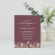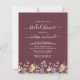 Este elegante design boho floral apresenta uma borda de flores silvestres em aquarela sobre um fundo burgundy escuro. As palavras "chuva de presentes de noiva" e o nome da noiva aparecem em escrita caligráfica branca com floreios decorativos no início e no final, com o texto restante em fonte serifada. Um padrão de flor silvestre coordenado decora o verso do convite. (Para manter os floreios, substitua apenas as letras do nome da noiva, deixando os símbolos no lugar.)