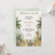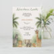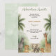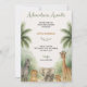 Convite de chá de bebê com o texto 'Aventura Espera' e animais da selva como zebra, leão, elefante e girafa contra folhas de palmeira. Tom neutro."
