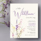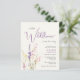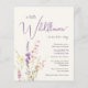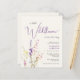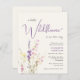 Um convite de chá de bebê de menina em creme claro econômico e elegante, apresentando "uma pequena flor silvestre está a caminho" em uma mistura de tipografia cinza moderna e uma escrita cursiva roxa estilosa, e um buquê de aquarela inspirado em boho de delicadas flores silvestres roxas, rosas e amarelas.