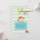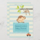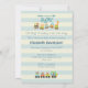 Um convite de chá de bebê - na frente, alguns macacos fofos estão pendurados, convidando seus convidados para um chá de bebê. No verso, há uma ilustração artística de uma creche infantil com tema de trem de brinquedo cheio de animais caprichosos. Definido em um fundo listrado de creme e azul.