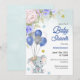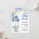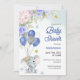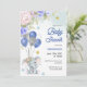 Cartão de convite de chá de bebê com um design de aquarela apresentando um elefante fofo segurando balões azuis, cercado por flores pastéis e estrelas. Os detalhes do convite são impressos em letra cursiva azul. O verso do cartão é simples.