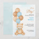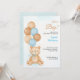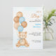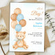Convite de chá de bebê com um ursinho fofo segurando balões azuis e marrons. "É um menino!". Tons de azul claro e bege criam uma atmosfera alegre.