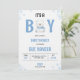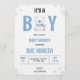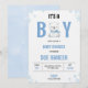 Convite de chá de bebê com um urso fofo e design de flocos de neve. O texto anuncia "É um Menino" com detalhes do evento em homenagem a Sue Vaneer em 28 de janeiro às 18h em Austin, Texas.