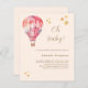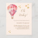 Um balão de ar cor-de-rosa e pêssego com estrelas douradas. Convite de chá de bebê em estilo vintage celebrando uma menina. Texto: Oh Bebê! Fundo cor de pêssego. Personalize e adicione um nome e detalhes do evento.