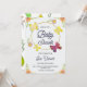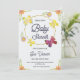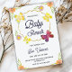 Convite de chá de bebê elegante com desenho floral com flores laranja e amarelas. Os detalhes incluem evento para Sue Yaneer, em 15 de janeiro em Anchorage.