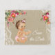 Cartões-postais de convite de chá de bebê em renda de estopa com adorável bebê menina em um fundo rústico de estopa e renda floral pérola. Esses cartões-postais de convite de chá de bebê em renda de estopa rústicos e charmosos são facilmente personalizados para o seu evento, basta adicionar seus detalhes. Você pode mover, remover e redimensionar o bebê conforme necessário.