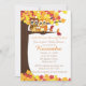 Olhe quem está tendo gêmeos! Celebre a chegada dos gêmeos com este convite de chá de bebê. Ele tem um fundo colorido com uma árvore que tem folhas brilhantes de outono em vermelho, amarelo e laranja. Há uma família de corujas: o pai, a mãe e 2 bebês sentados em um galho na árvore. Eles têm cachecóis listrados em tons de outono ao redor do pescoço. Personalize adicionando as informações da sua festa no centro. Confira os muitos outros produtos e designs desta coleção.