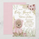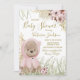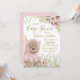 Convite de chá de bebê de menina com grama pampas e ursinho fofo vestindo um suéter em um fundo floral de grama pampas. Este convite de chá de bebê de ursinha menina é facilmente personalizado com os detalhes do seu evento.