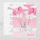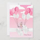 Convite de chá de bebê menina com chupeta flutuando em um balão de ar quente rosa.