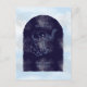 Um convite de chá de bebê menino em um céu azul pálido nublado e estrelado com um arco azul escuro envolvendo um pequeno elefante azul.